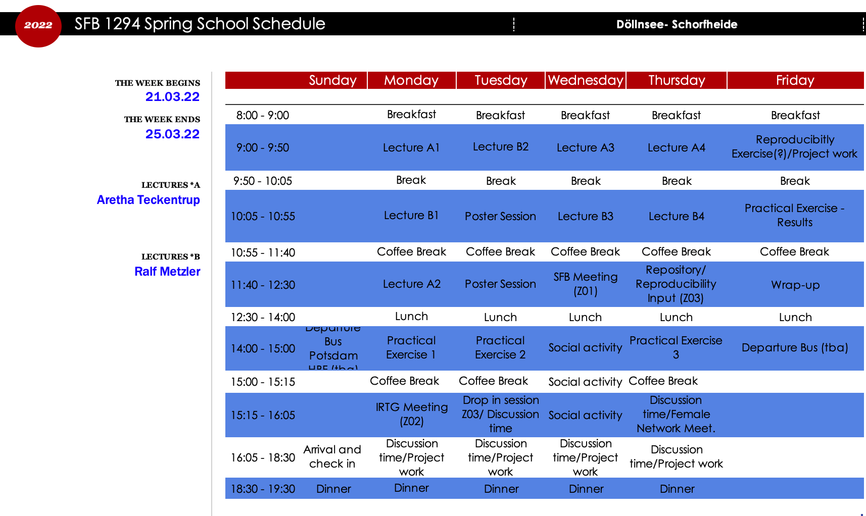 All members of the SFB as well a number of external PhD students and Postdocoral researchers will discuss recent scientific advances with our invited guest speakers and will have time to advance collaboration across projects. The program will include talks and lectures, exercises, a poster session and social activity. A number of places will be openly advertised for external PhD students and Postdoctoral researchers to participate in the Spring School.