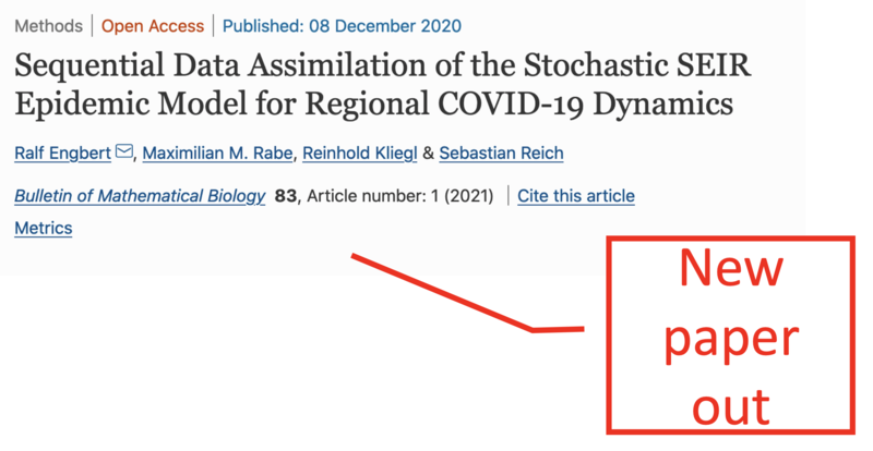 The study our PIs Ralf Engbert and Sebastian Reich on Sequential Data Assimilation of the Stochastic SEIR Epidemic Model for Regional COVID-19 Dynamics has now been published Bulletin of Mathematical Biology  and is freely accessible here. Find more information on the study including the link to the dashboard displaying the data etc. in our News from Spring 2020.
